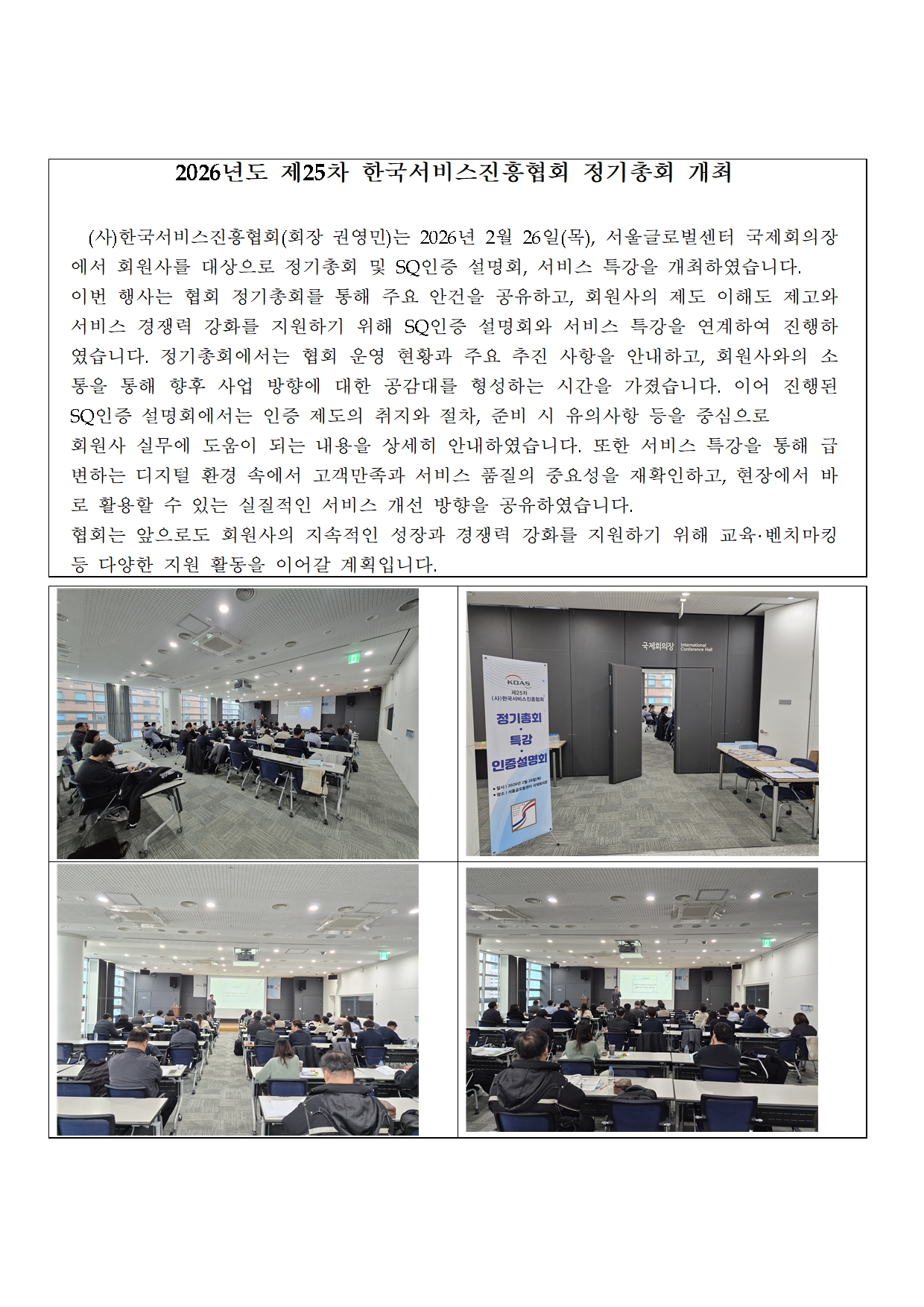 한국서비스진흥협회 정기총회, 서비스특강, SQ인증 설명회 개최작성일 2026-02-26 | 조회수 11